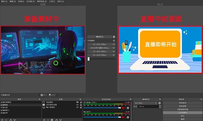而且比较专业的是,它还有提供了一个 Studio Mode「工作室模式」,如上图,可以在不影响前台直播的同时,在后台准备好不同的画面素材,再推送给观众,让直播观众的观感和体验更好。